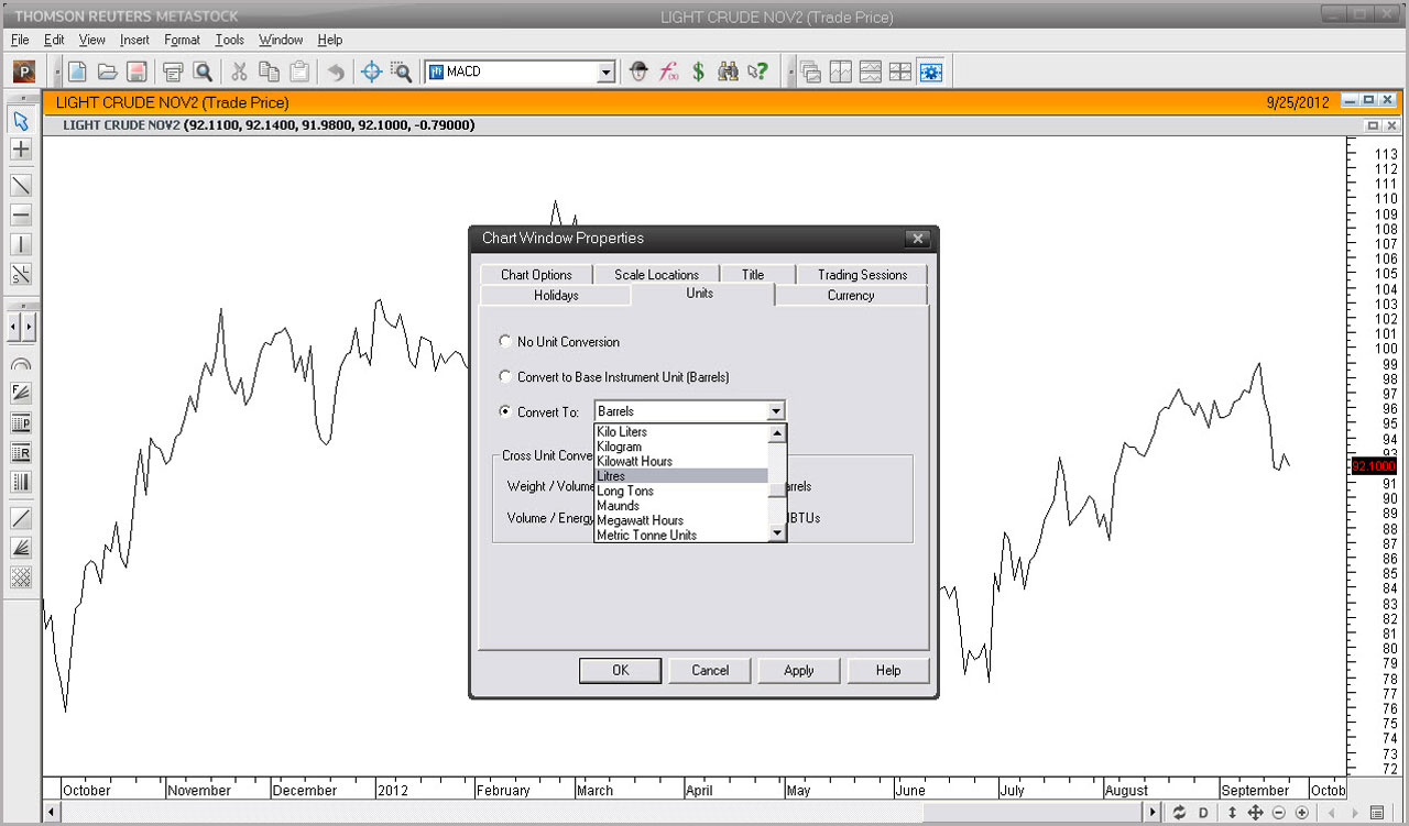Mit der "Unit Conversion" Funktionalität konvertieren Sie Barrels in Gallonen, Tonnen in indische Maunds oder Gigajoules in MWh. MetaStock Pro XIII kennt 45 verschiedene Umrechnungspaare zwischen Arrobas, Bushels, Candy, Kubikmeter, um nur einige zu nennen.